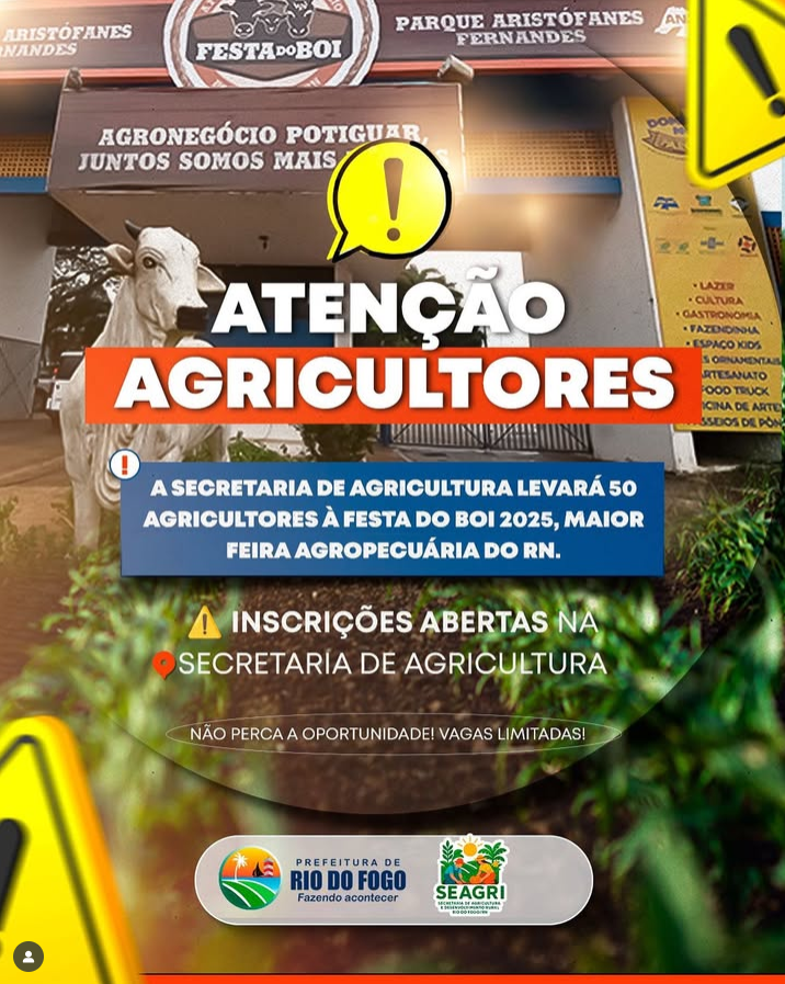 A Secretaria Municipal de Agricultura de Rio do Fogo estará promovendo uma importante ação de incentivo e valorização dos nossos produtores rurais: 50 agricultores do município estarão participando da Festa do Boi 2025, a maior feira de exposição agropecuária do Rio Grande do Norte.