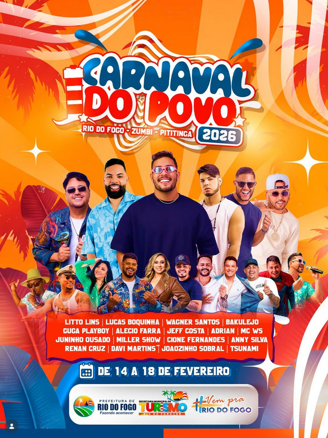 A Prefeitura de Rio do Fogo lança oficialmente as atrações do Carnaval do Povo 2026, que promete muita alegria, cultura e animação para moradores e visitantes!
